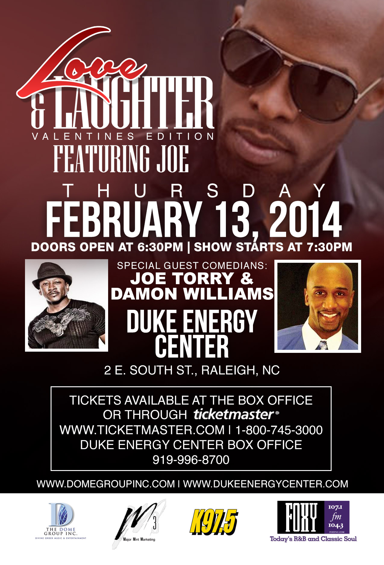 Start planning your Valentine’s Day for your special someone with tickets to the Love and Laughter Concert featuring Joe and comedians Joe Torry and Damon Williams. Concert is February 13th. Doors open at 6:30pm.