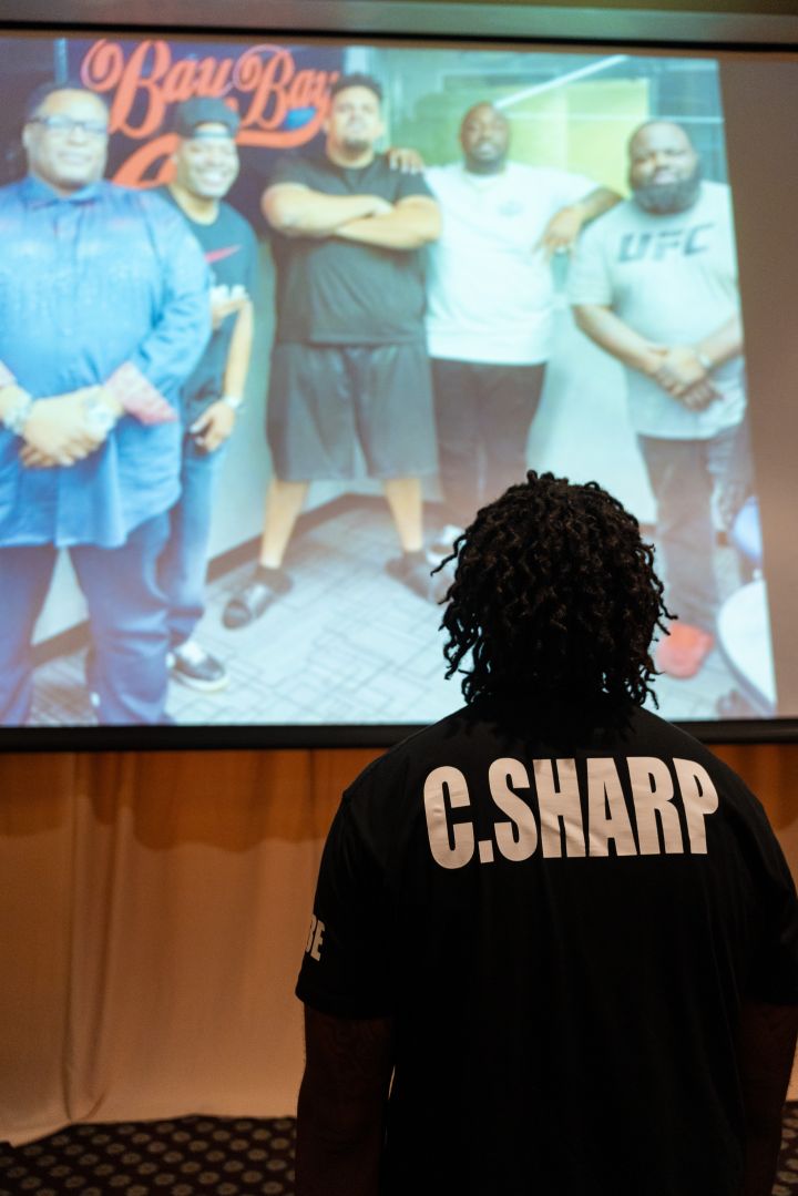 HOUSTON, TEXAS – AUGUST 29: DJ Csharp speaks on stage during the Justin “BeatKing” Riley Celebration of Life at Bayou City Event Center on August 29, 2024 in Houston, Texas. (Photo by Marcus Ingram/Getty Images) color image,photography,celebrities,arts culture and entertainment,horizontal,usa,celebration,texas,houston – texas,event,gulf coast states,stage – performance space