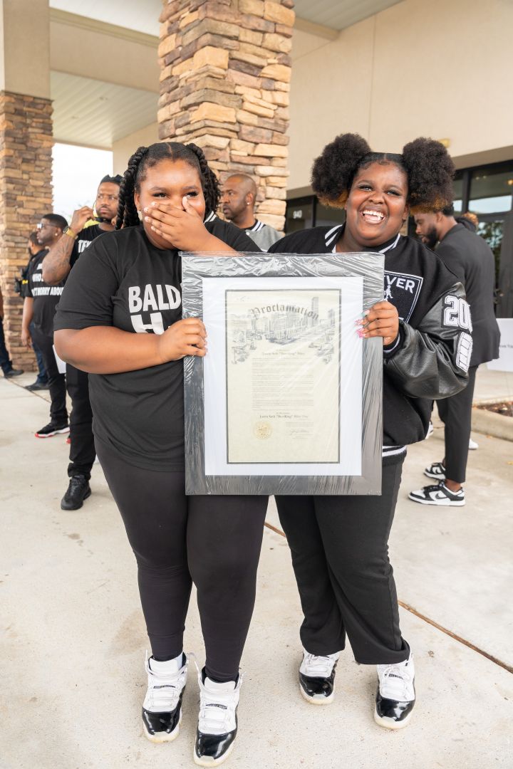 HOUSTON, TEXAS – AUGUST 29: DJ Hollygrove, Tasha Felder and BeatKing’s daughters Kayla and Jayla pose on stage during the Justin “BeatKing” Riley Proclamation for the City of Houston at Bayou City Event Center on August 29, 2024 in Houston, Texas. (Photo by Marcus Ingram/Getty Images) color image,photography,celebrities,arts culture and entertainment,horizontal,usa,females,daughter,texas,houston – texas,event,gulf coast states,stage – performance space