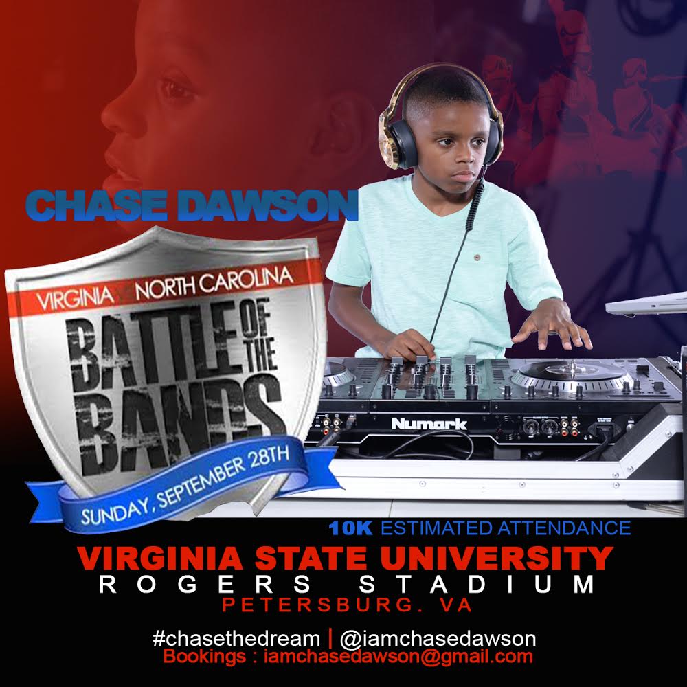 Get your tickets now to the Battle of the Bands at Virginia State. Over 10k are expected to be at Roger’s Stadium for the all out battle brawl. Guest Dj, kid sensation, Chase Dawson will be in attendance. Related Stories: New… Chase Dawson Promo Shoot!!! Chase Dawson DJs Battle of the Bands in Virginia Text […]